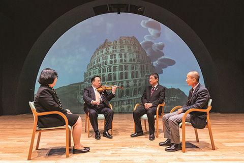 会場は、遠隔でのコンサートやパフォーマンス配信などにも対応する東京藝術大学「Arts & Science LAB.」の球形ホール。COI拠点として、「感動」を創造する芸術と科学技術による共感覚イノベーションをテーマに研究開発を行っている場所でもある。当日の背景は、球形スクリーンに映し出されたバベルの塔。恐れ知らずの人類への戒めとされるその故事は、経済や科学の発展を目指し突き進んできた現代社会に新型コロナウイルスが与えた教訓と通じるものがあるように思える。