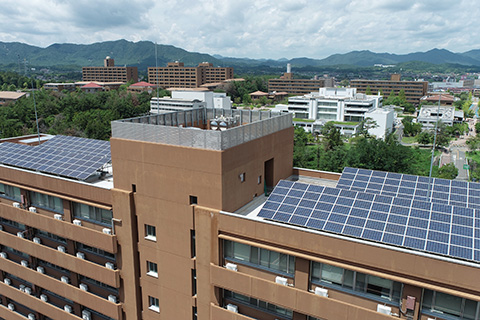 広島大学では、5メガワットの大規模太陽光発電の導入など、広大な敷地を活かした様々なプロジェクトも進められています。最新のエアコンと地中熱利用、その他の再生可能エネルギーに関する取り組みをうまく組み合わせて、二酸化炭素排出量を削減していくのが最適解であると思います。